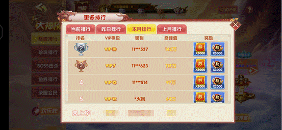 在游戏大厅内大神榜内,巅峰排行榜月榜前 5 名玩家除了可以获得鱼券奖励外,还可以获得一定数量的易令奖励哦 ~~~